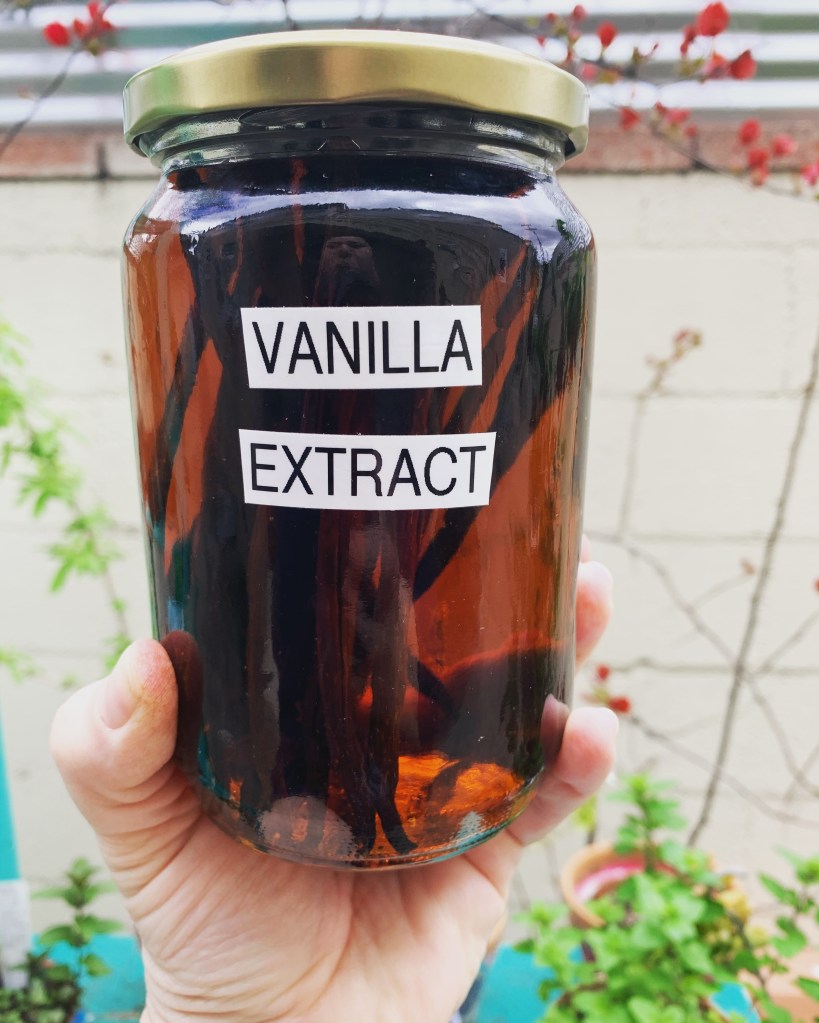 You need grade B vanilla beans & alcohol! You can use vodka (the most neutral), bourbon, brandy or rum. I believe that you can use just about any spirit. I filled up my jar with 20 vanilla beans and brandy.
