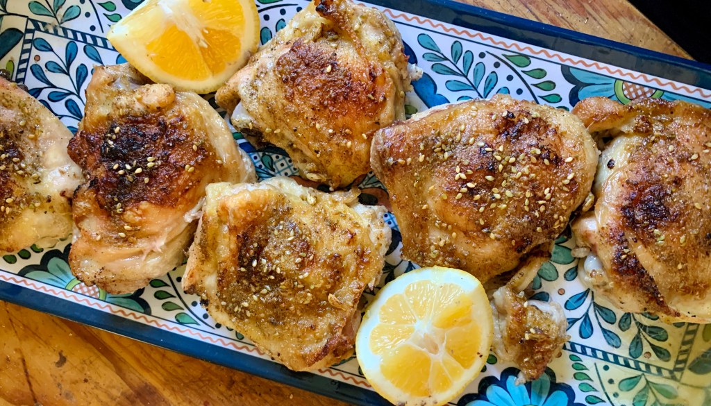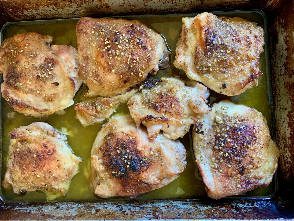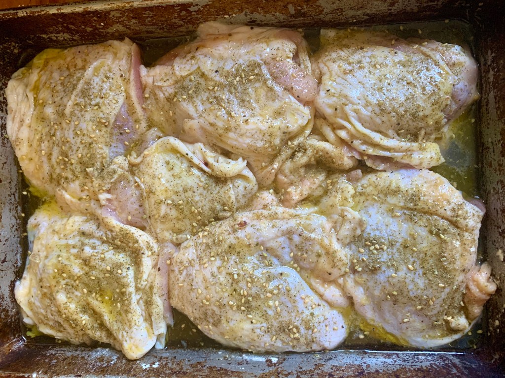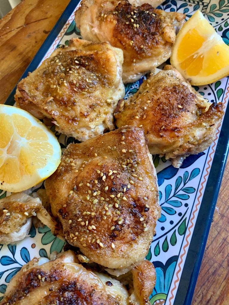 My second favorite way to use za’atar is on oven baked chicken. It is especially great on thighs and drumsticks, as you will see in this post!