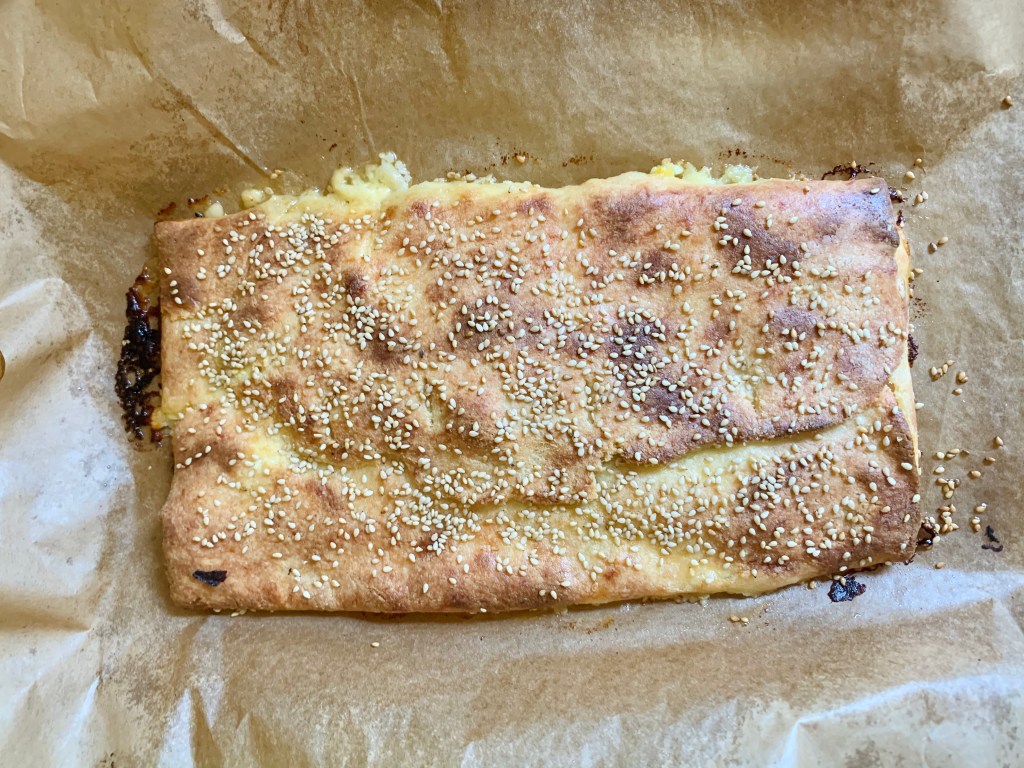Using the parchment you will fold over the pita to make a flat roll. Fold in all sides. Drizzle olive onion and sprinkle toasted sesame seeds and oregano.