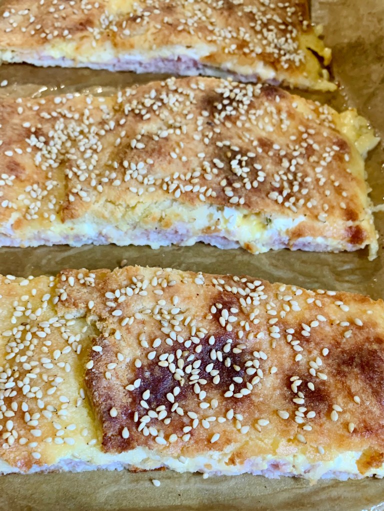 The zabonotiropita is made with smoked ham, Gouda, a little feta, and I add mustard to it.