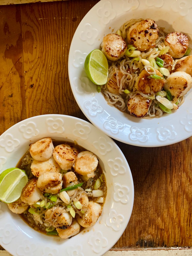 Plate it and place the seared scallps on top. Spoon the leftover sauce in the pan over the top and finish it with a generous squeeze of lime!