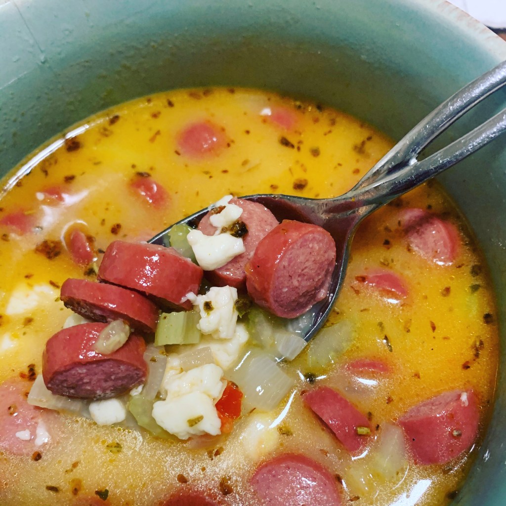 In a medium size pot, melts pat of butter to sauté finely chopped shallots & celery. Toss in sliced hot dogs. Add in bone broth and water. A tbsp or two of harissa sauce. A tbsp of the tirokafteri (spicy feta cheese spread) I made. Chopped pieces of halloumi cheese from Cyprus. Salt & pepper to taste.