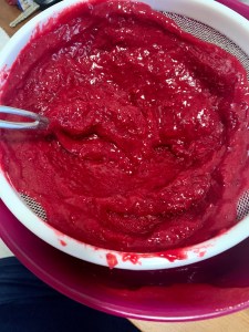 You start the filling by simply making cranberry sauce! It can be your own favorite recipe that you make every year. I processed that in a blender and them pushed that through a mesh strainer in order to discard the cranberry skins. So the first step is likely something you already do every Thanksgiving! Easy!