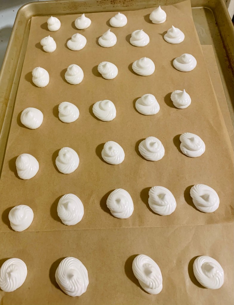 Place it in a piping bag and pipe out the merignue onto a parchment lined baking sheet. Bake at 200 F for an hour and let it sit in the oven and another hour to dry out.