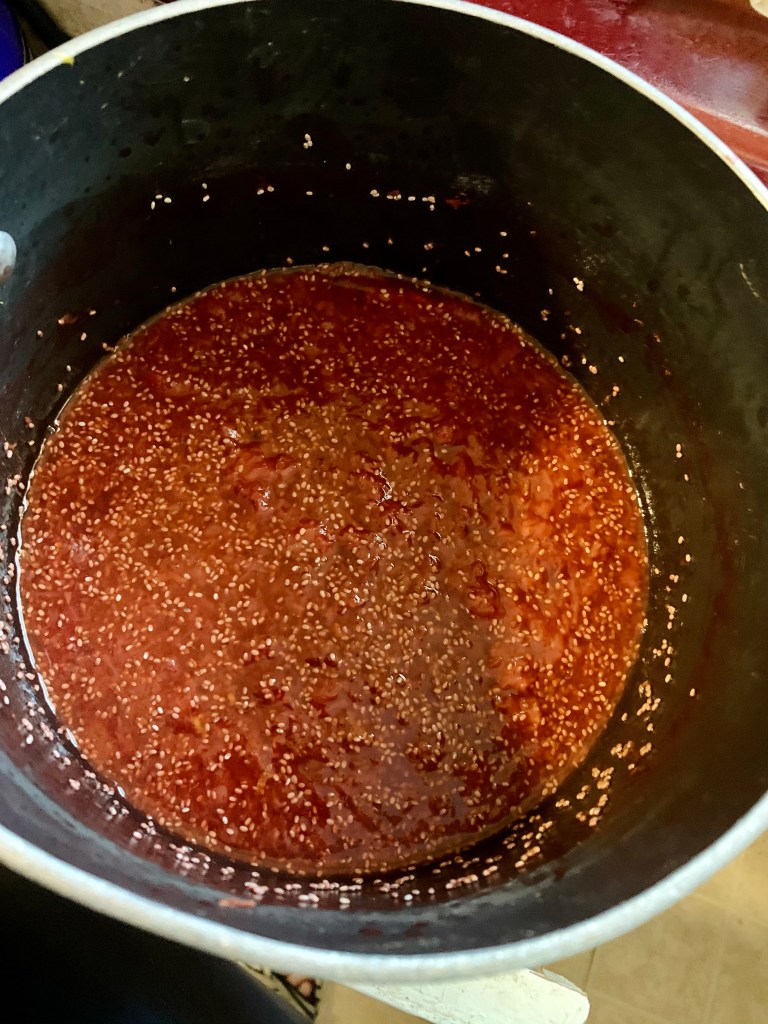 So I only make my jam in small batches. One jar at a time. It does not take long at all. No more than 30 minutes including washing my fruit, cooking it, mashing it, and adding in chia seeds.