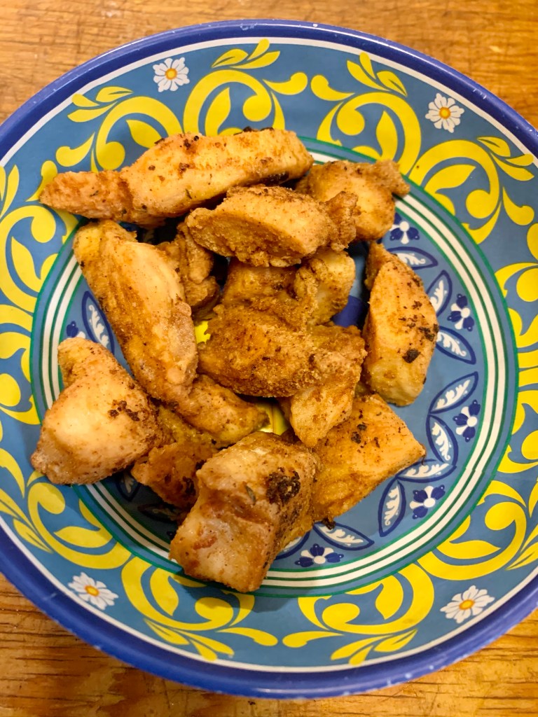 Cube up your chicken breast. Toss all of the dry spices in a bowl. Then toss the cubed chicken with the dry ingredients to fully coat.