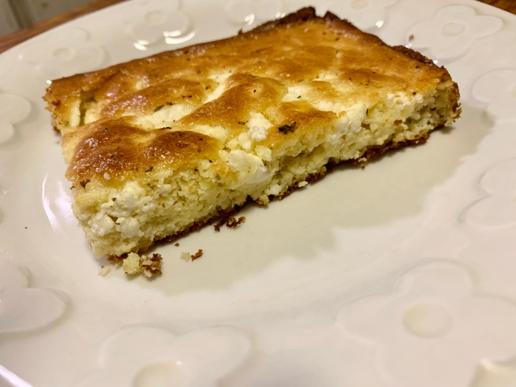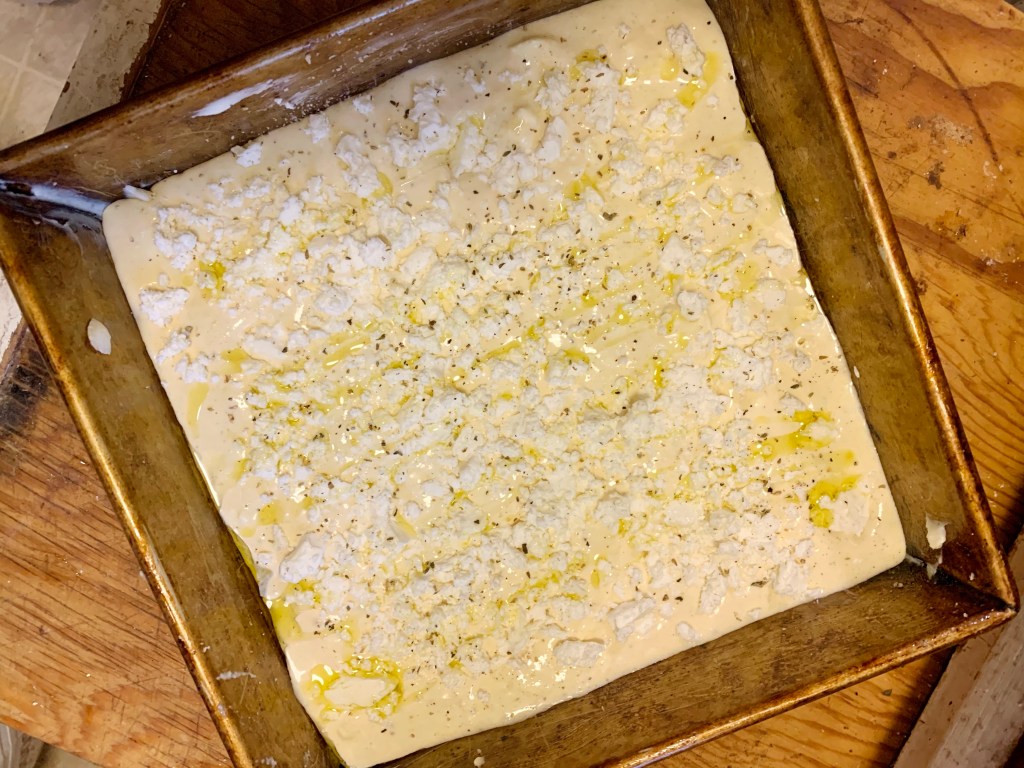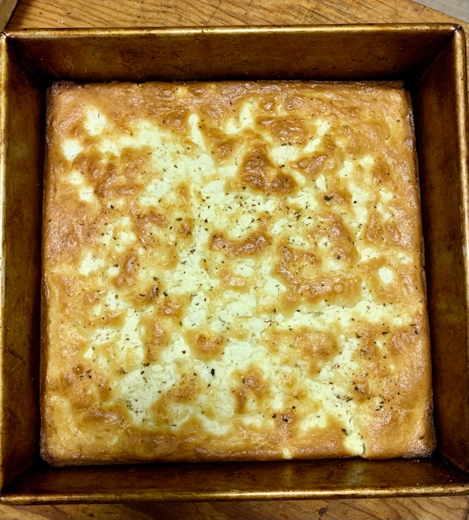 Butter a 9x 9 baking pan. Pour in the batter. Crumble the rest of the feta cheese on top. Crack a little fresh pepper & sprinkle a pinch of oregano. Drizzle olive oil on top. Bake for 45 minutes or until golden brown.