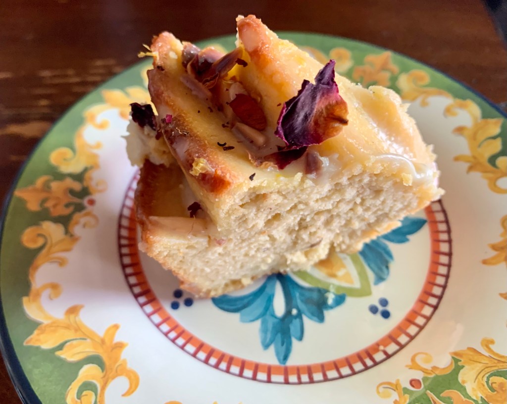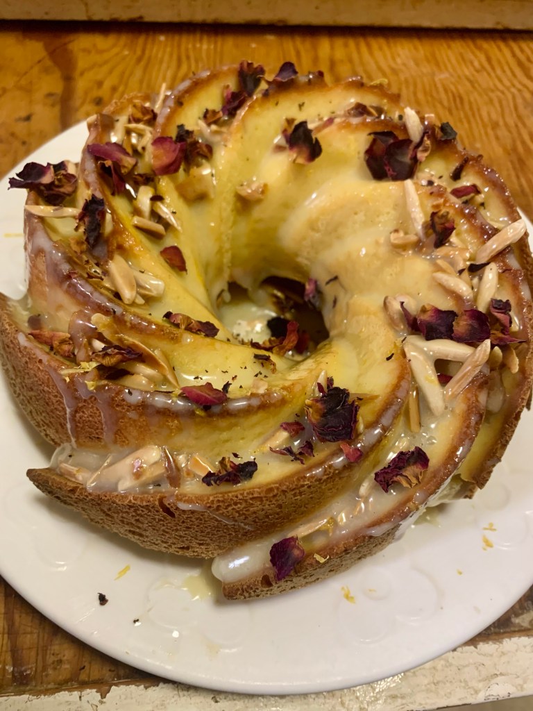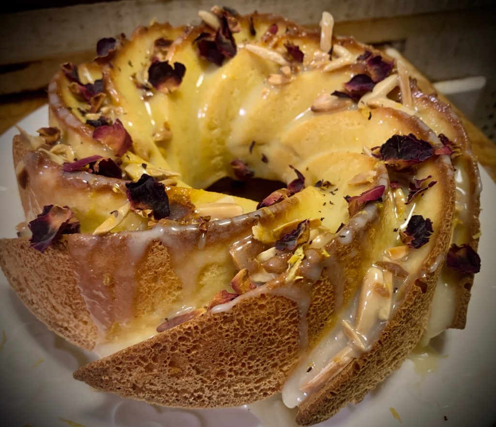 This beautiful bundt cake will be a hit at your next gathering! It is made with almond flour, olive oil, Greek yogurt, lemon zest and ouzo! Glazed with white chocolate, and garnished with toasted almond slivers, lemon zest and dry edible rose petals. This is my take on a lemenoladopita, or lemon olive oil cake, which is a type of cake made in various areas of the Mediterranean Sea, where olive and lemon trees grow fervently.