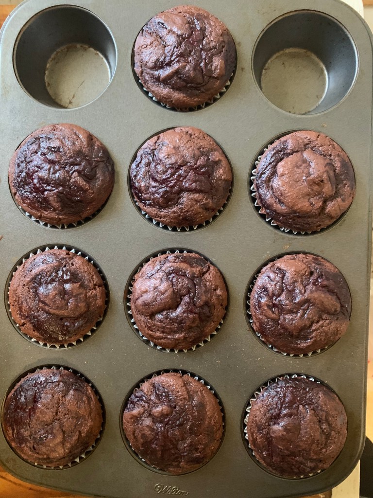 Spoon your batter into the liners. I added a teaspoon of homemade sugar free berry jam onto the surface of the batter, and gently swirled it around.