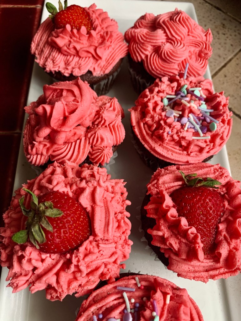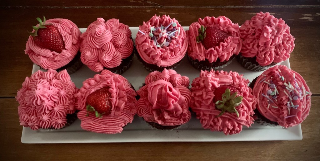 Now it’s up to you how you wish to decorate them. I am very new to cake & cupcake decorating, so I experimented with three different piping tips. I added strawberries to a few, sprinkles to others, and edible glitter, and left a couple of them plain.