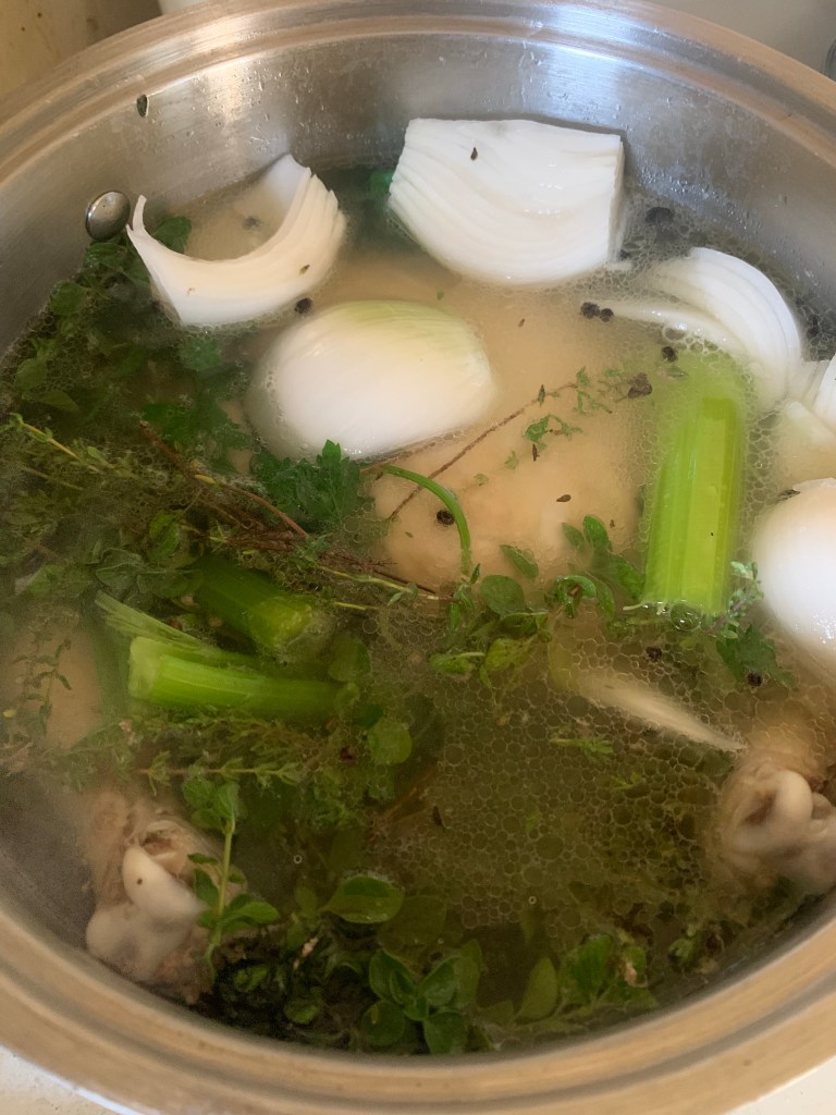 Now there are many things that you put into your stock. I often opt for fresh herbs like thyme, oregano and parsley. A whole onion and a few cloves of garlic, along with whole peppercorns, bay leaves, celery and sea salt. Often my choices will depend on what I want to make with this stock and the chicken. Other times I might add lemongrass, ginger and star anise.