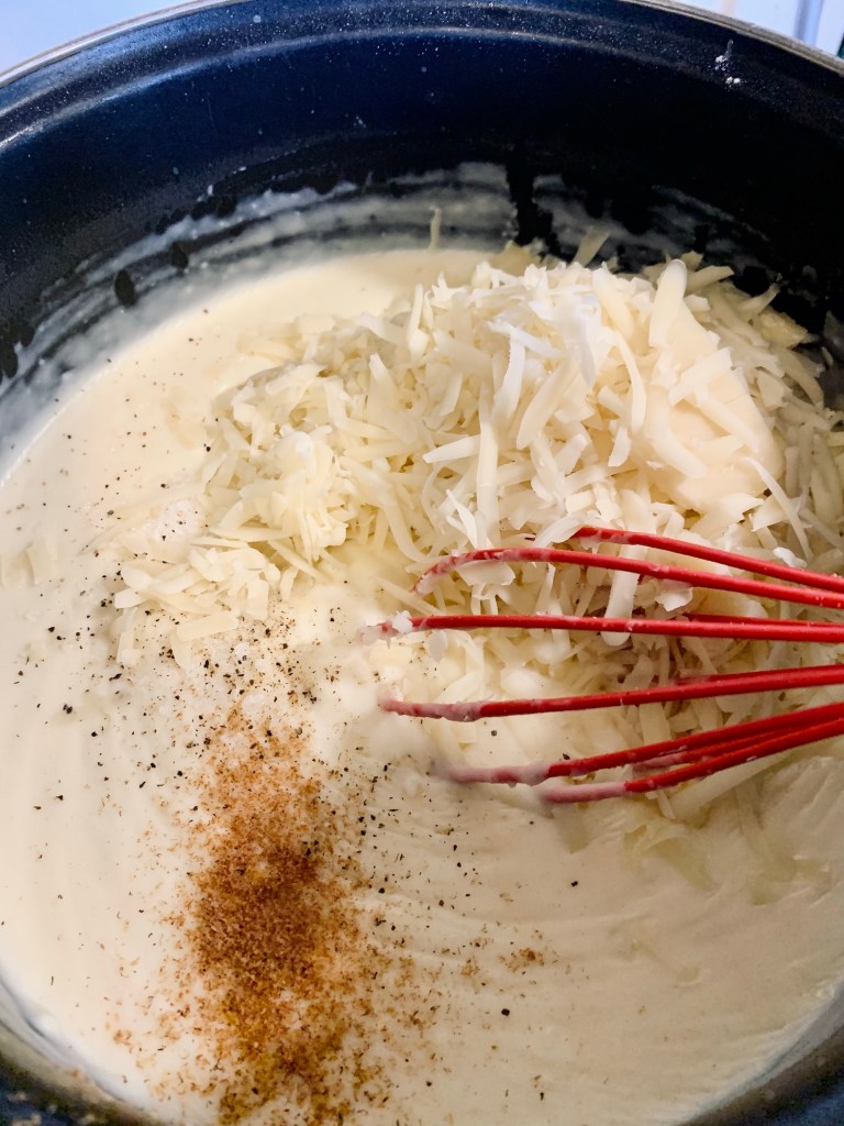 Pour in the milk little by little while stirring, so that it will thicken as you go. When it has thickened and you can see the lines from the whisk in the mixture, turn off the heat. Add in the salt, pepper, nutmeg and gruyere. Whisk till thoroughly combined.