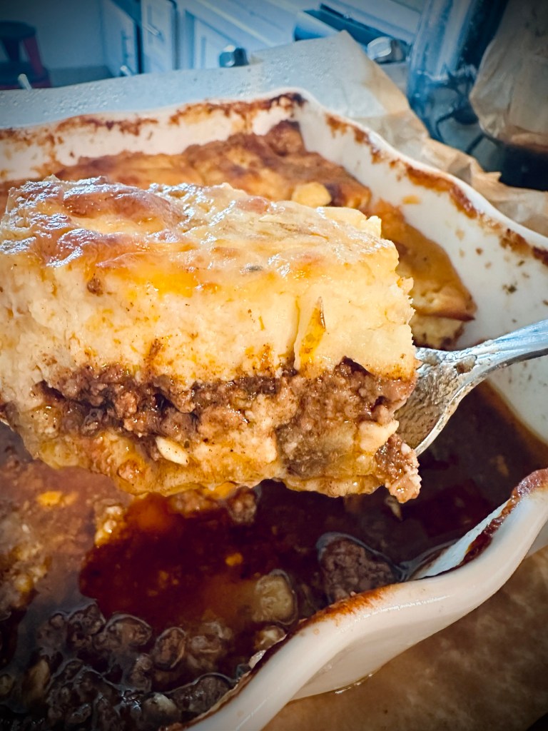 Ladle this over the meat layer. At this point you can grate a little more nutmeg & black pepper on top, and a tablespoon or two of grated Parmesan or aged Mizithra cheeses. This layer of cheese with help give it a nice crust.