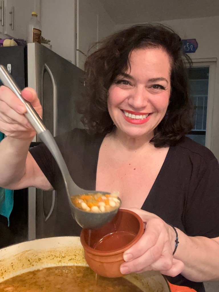 Most folks use tomato paste. She omitted it and preferred the juice of grated tomatoes instead. It’s adds freshness to the dish. So while the soup is hearty, it is also light.