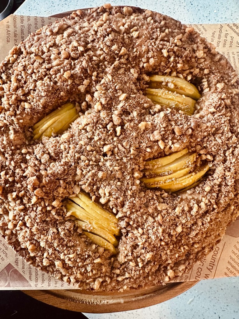 You can also thinly slice a third apple to decorate the top. Finally before baking, I topped it with a mixture of ground walnuts, sugar and cinnamon & it takes the cake to another level of heavily! You can of course skip the garnish & a dusting of powdered sugar will suffice.