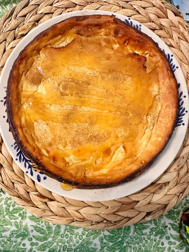 This beautiful and light cheesecake hails from the Greek island of Sifnos in the Cyclades. It is a simple recipe that comes together in no time! It’s called Melopita, which is Greek for honey pie.